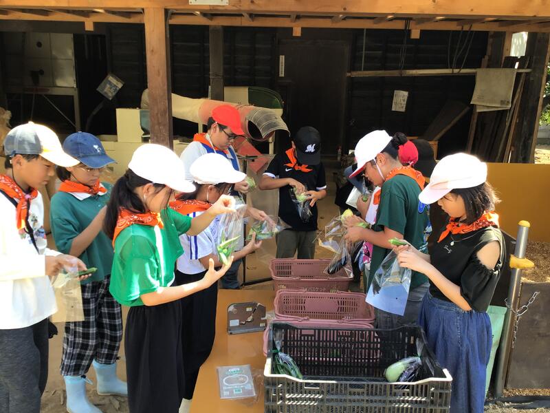 ①「農家のおしごと体験」では,実際に農家へ行き,種まきや土づくり,ナスやオクラの収穫から商品の袋詰めまで様々な仕事を行いました。ものすごい暑さでしたが,熱心に活動していました。