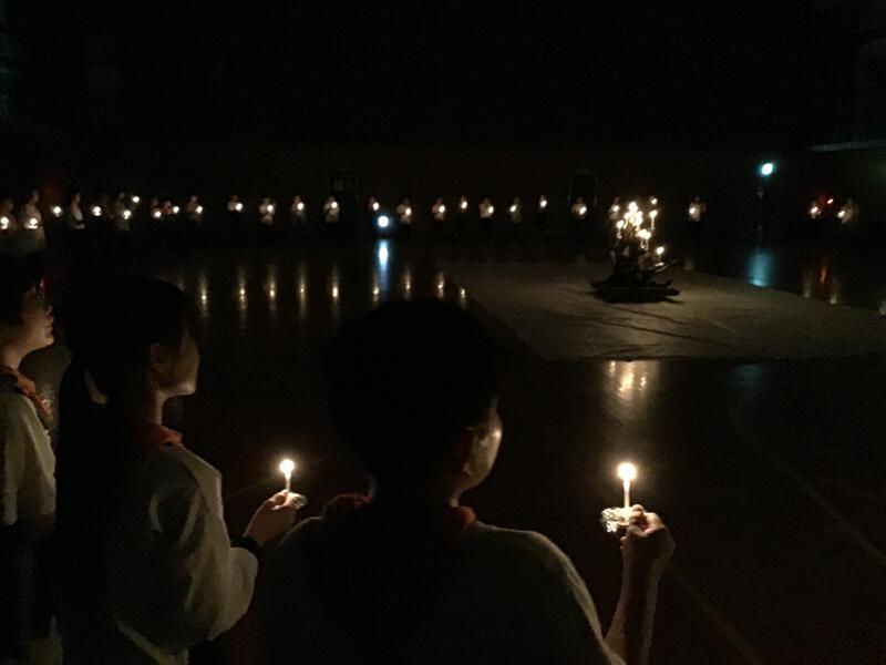 残念ながら天気が悪く,体育館でのキャンドルファイヤーに変更になりましたが,それはそれで雰囲気があってとても素敵なんです。