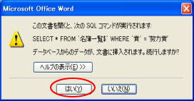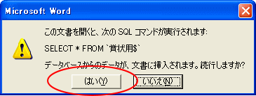 ・印刷したいWordファイル(u_syoujyou.doc)を開き、 下記の様なメッセージが表示されるので、はいをクリックします。 ![]() |