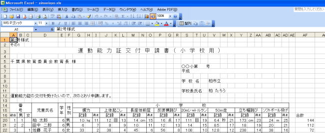 Excelの申請者名簿ファイル(sinseisyo.xls)を開き、申請者名簿を作成し、保存します。 データを入力(コピー)してください。 ※見出しの変更・合計得点の入力は、できません。 ※賞状の氏名の部分は7〜8文字分の枠しかとっていません。 それ以上の文字数になる児童には、差込の名簿を使用せず個別に手入力して印刷してください。 ![]() |