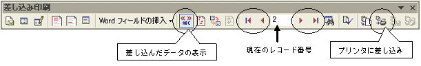 ・ワード画面でメニュバーの「表示」→「ツールバー」→「差し込み印刷」をクリックし、「差し込み印刷」ツールバーを表示させます。![]() |