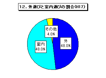 外遊びと室内遊びの割合は同じです。子どもたちが遊んでいる場所を詳しくみると,自分の家と公園の割合が多くなっています。これは10年前,5年前と比較しても,あまり変わっていないようです。(駐車場での遊びは10年前には見られなかったようですが・・・) また,保護者は公園や校庭・園庭などの外で遊ばせたいと思っていることがわかります。 |