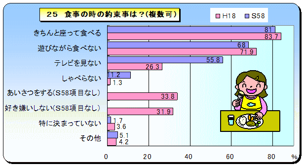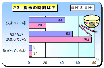 20年以上前は,食事自体を重視して,食べさせている傾向があったようですが,現在は食事の時間ををコミュニケーションの場として,ゆっくり楽しみながら食事をすることを重視しているように思えます。 また,食事の時間が以前に比べてきちんと決まっている家庭が少なくなり,だいたい決まっているという家庭が多くなっています。生活が不規則というわけではなく,子ども(兄姉も含める)の習い事や親の仕事の都合で多少ずれることがあるのでしょうか。 |