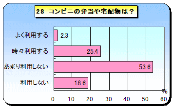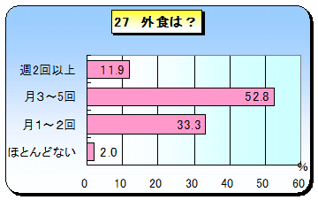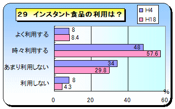 コンビニ弁当や宅配物に頼った食事の姿は浮かんできません。インスタント食品については「時々利用する」が増えてきています。また,外食についても同じく平成4年度調査に「時々利用する51%」「あまり利用しない34%」「利用しない7%」という結果がありますが,今回の調査結果の方が利用回数が増えてきています。しかし,インスタント食品や外食共に,それに頼るのではなく上手に利用してるという印象を受けます。 |