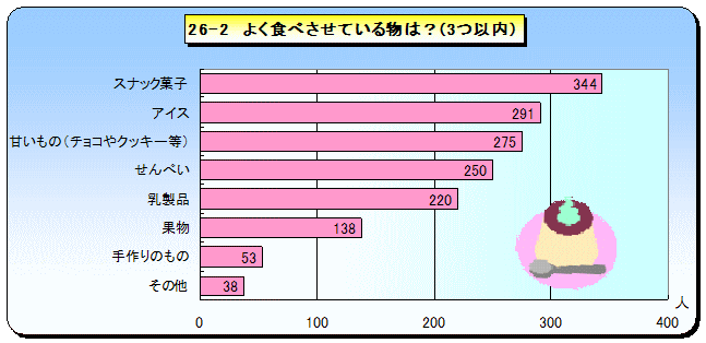 おやつの時間もほぼ決まっているようです。また,食べるものはスナック菓子や甘いものなど(アイスが多いのは調査時期が夏だったためでしょう)製品化された菓子類がほととんどで,手作りのものは少なくなっています。ここにグラフは載せていませんが,平成4年度のおやつ調査に「市販と手作り半々が58%」という結果があります。現在の方がさらに市販のものが多くなっているのは,コンビニなど身近で手軽に買えることとも関係があるのでしょうか。 |