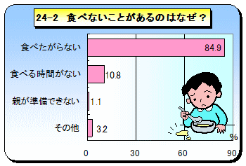 毎朝,親が朝食をきちんと準備して食べさせている家庭が多いことがわかります。一方,食べないことがあるという理由の大半を「食べたがらない」「食べる時間がない」が占めています。毎日しっかりと朝食を取るためには,やはり早寝早起きがキーポイントとなりそうです。 |