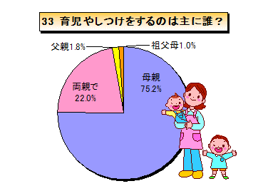 『育児やしつけ』を主にしているのは「母親」という家庭が全体の約3/4で,「両親」でという家庭は1/4に満たない状況です。育児に対する母親の負担の大きさがうかがえます。