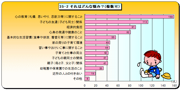 『悩みの内容』は「心の教育(礼儀,,思いやり,忍耐力等)に関すること」が最も多く,次に「友達関係」「経済的負担」「心身の発達」「基本的な生活習慣」と続いています。また,保育園児の保護者の半数近くが「子育てと仕事の両立」で悩んでいることも分かります。