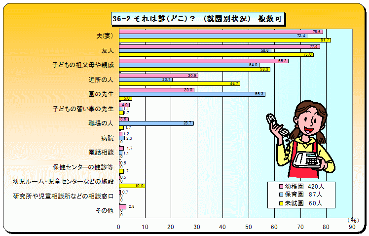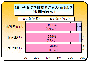 『子育てを相談できる人(所)がいない(ない)』は約7.5%で,就園別では幼稚園児の親にやや多いようです。また,『主な相談先』は「夫(妻)」「友人」「祖父母や親戚」ですが,子どもが就園している場合は「園の先生」も多いようです。