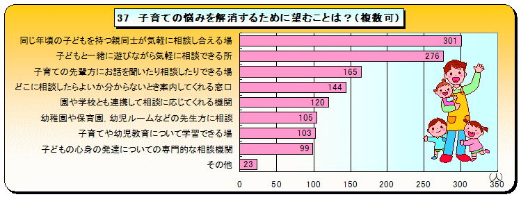 『悩み解消のために望むこと』では,「親同士が気軽に相談できる場」「子どもと一緒に遊びながら気軽に相談できる場」を望む親が半数近くいます。特に未就園児の親の期待は大きいようです。また,他の「先輩方に相談」「相談の案内窓口」「園や学校とも連携した相談」「専門的な相談」などについてもそれぞれ約2割〜3割の親が望んでおり,多様な悩みに対する様々な支援が求められていると感じます。