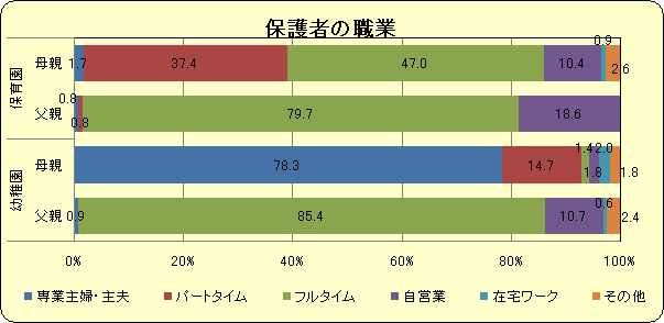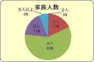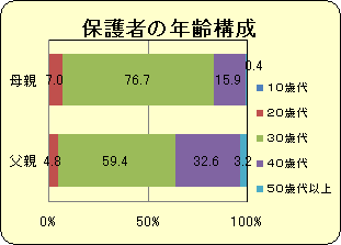 30歳代の親が6〜7割を占めています。家族の人数と子どもの人数をみると,4人家族・子どもが2人の家庭がそれぞれ6割を占めることから,核家族が多いと思われます