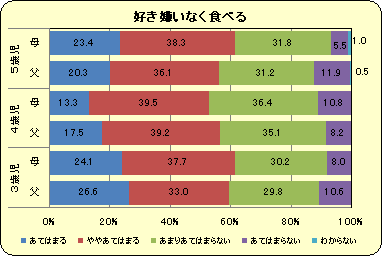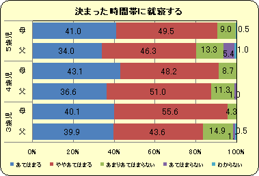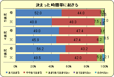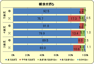 子どものよりよい成長にとって大切だとされ,推進されている『早寝・早起き・朝ごはん』に関する項目ついては『あてはまる』『ややあてはまる』があわせて8〜9割を占めており,親の意識の高さがうかがえます。しかし『決まった時間に就寝する』で約10〜20%,『朝食をとる』で約5%が,『あまりあてはまらない』『あてはまらない』ということは気になる点です。