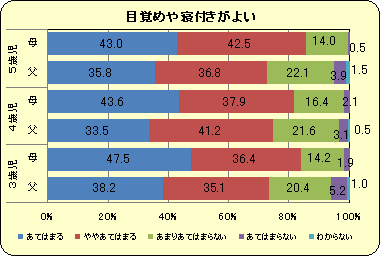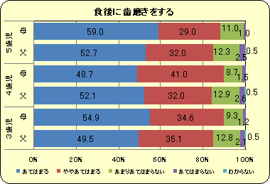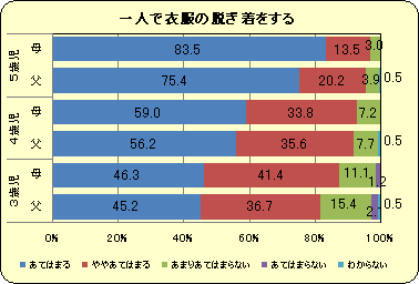 『一人で衣服の脱ぎ着をする』については年齢と共に『あてはまる』が増えていき,子どもの成長と共に身についていく様子がうかがえますが,『目覚めや寝付き』『好き嫌いなく食べる』『食後の歯磨き』については,年齢による変化があまり見られないようです。 |