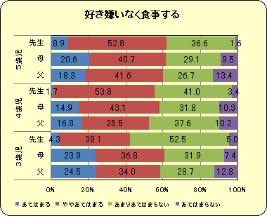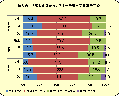 『好き嫌いなく食事する』に関しては,父親・母親より先生の方が『あてはまる』という回答が少ないという結果が出ています。家庭では我が子の好きなメニューが多いなど,園と家庭での献立に違いがあるのかもしれません。一方『あてはまらない』という回答も先生の方が少なくなっています。園では嫌いなものでも残さず食べようとがんばっている子どもの姿がうかがえます。同様に食事のマナーに関する項目も,『あてはまる』『あてはまらない』の両方が,家庭より園の方が少なくなっています。また『ややあてはまる』までを見ると,母親より父親の方が厳しい目で見ているようですが,一緒に食事をする回数の差が影響していることも考えられます。