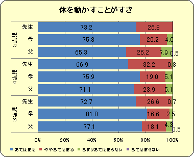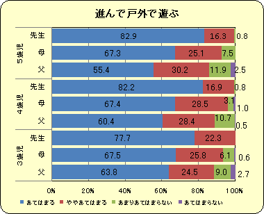 子どもは『体を動かすことが好き』であることは,先生も親も同じように感じています。しかし『進んで戸外で遊ぶ』に関して,先生から見るとほぼ100%『あてはまる』『ややあてはまる』と感じているのに対し,父親や母親は10%程度『あまりあてはまらない』としている点に意識の差を感じます。『家の近くには安心して遊べる場所がない』『家庭の中に外で遊ぶことの他に別の楽しみがある』ということでしょうか。