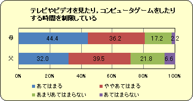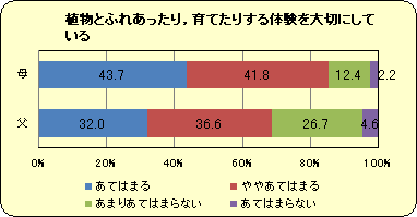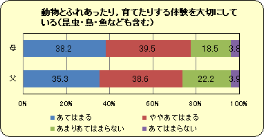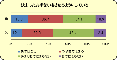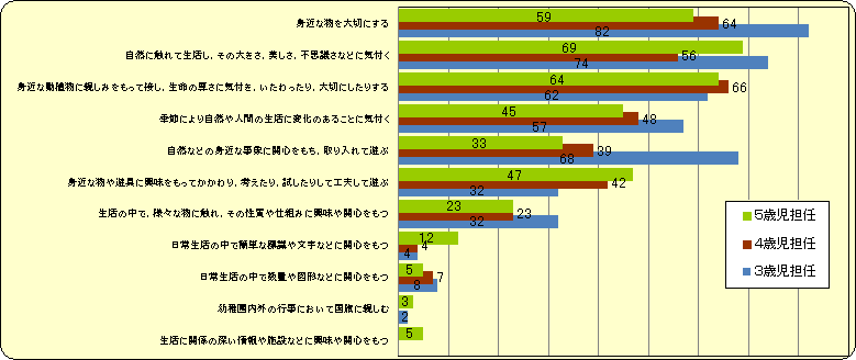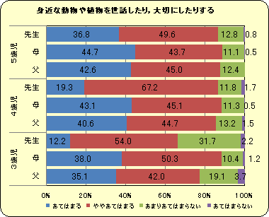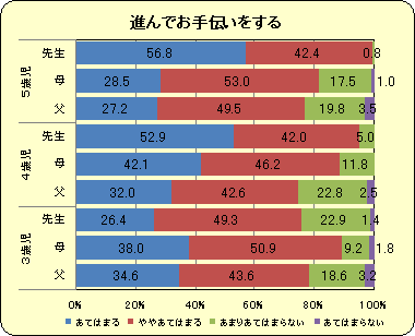 『お手伝い』について,親の評価は3歳児より5歳児の方が低いのに対し,先生は子どもの年齢とともに評価が高くなっていきます。園では決められた仕事があることに加え,年上の子どもが年下の子どもの世話をするという機会があり,そういった場面を大切に指導しているからではないでしょうか。園での取り組みや子どもの様子を家庭に知らせる機会を増やすとともに,家庭でも何らかの役割を子どもに任せていくことも必要ではないでしょうか。 |