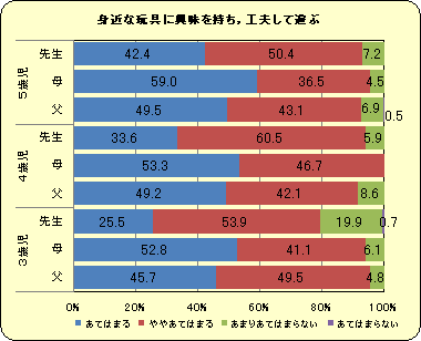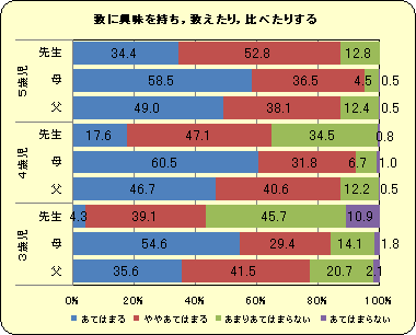 『動植物の世話』や『工夫した遊び』については,父親と母親の評価は似てますが,『数』や『マーク・文字』に対する興味については,どの年齢においても母親の評価が父親の評価より高いという結果が出ています。日常の生活の中で,子どもが母親に『なに?』『どうして?』とたずねる場面が多いからなのでしょうか。親の評価で年齢による差があまり見られないのに対し,先生の評価は年齢に従って高くなっていきます。親は現在の我が子を見ているのに対し,先生は様々な学年の子どもを見て回答していることが影響していると考えられます。